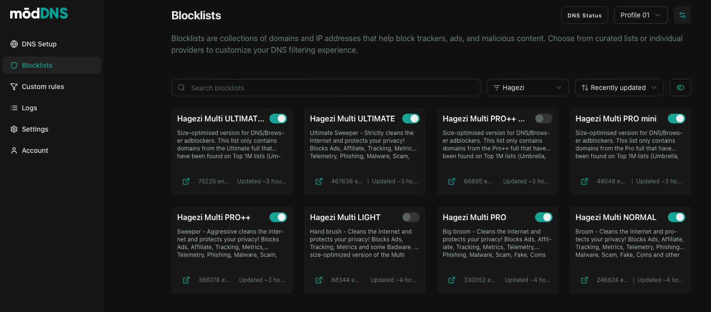 Blocklists > Choose from curated combinations or add community-compiled lists such as Hagezi, OISD, AdGuard, StevenBlack, etc. Enable or disable lists based on preferred balance between protection and potential breakage.